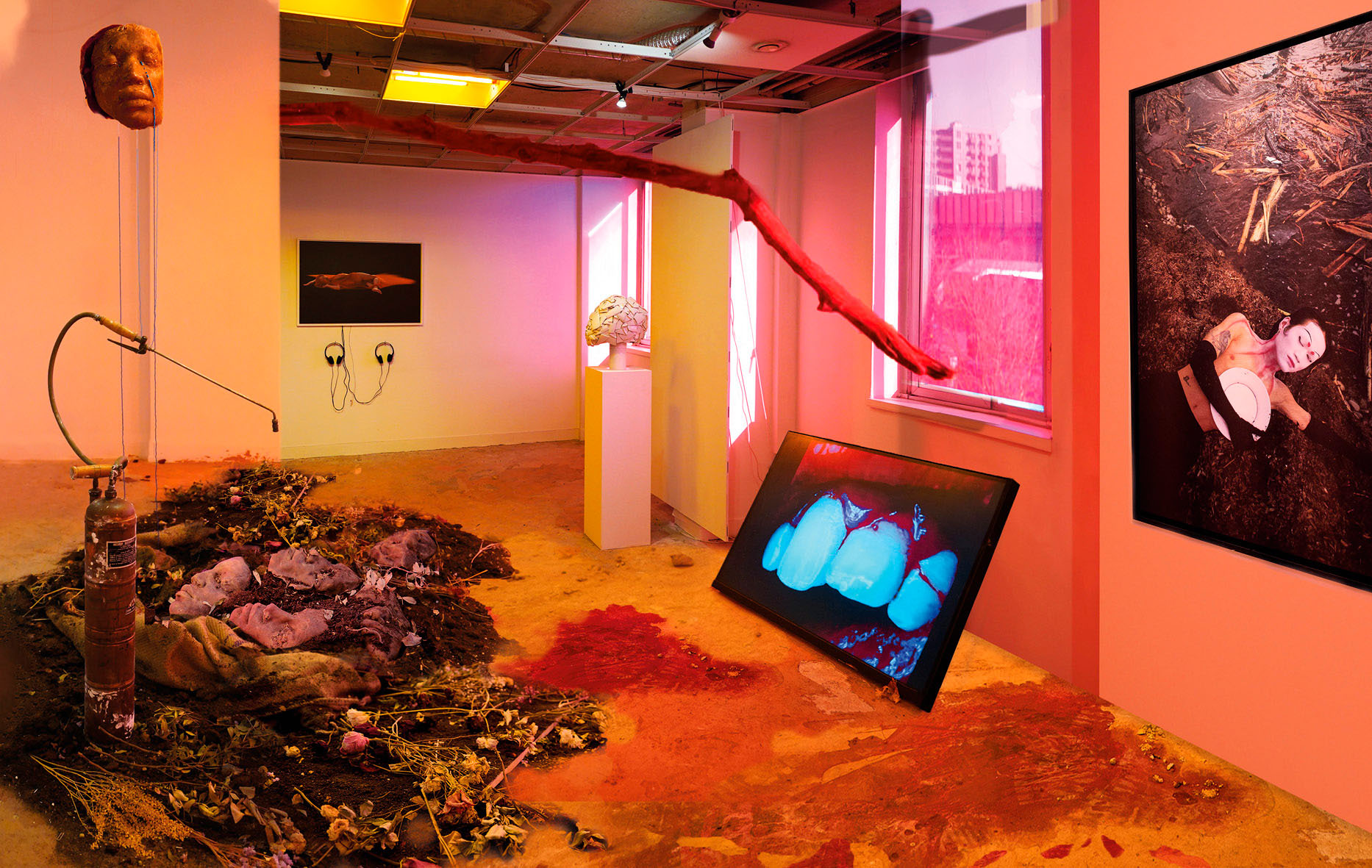 Exposition « Born Again, Raised by You », « Salle colère, aube et crépuscule ». Avec Beya Gille Gacha, Andrea Jankovic et Oxana Bertrand, Hoà ng Nguyên Lê, Cléophée Moser, et les traces de la performance Ensemencement de Myriam Mihindou © Eaux Fortes, 2022