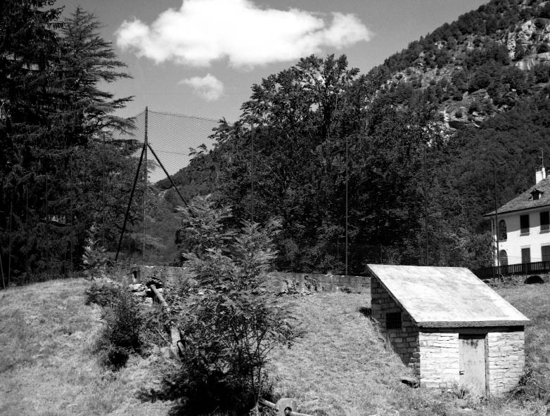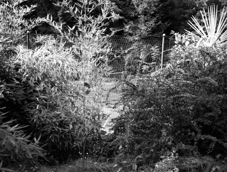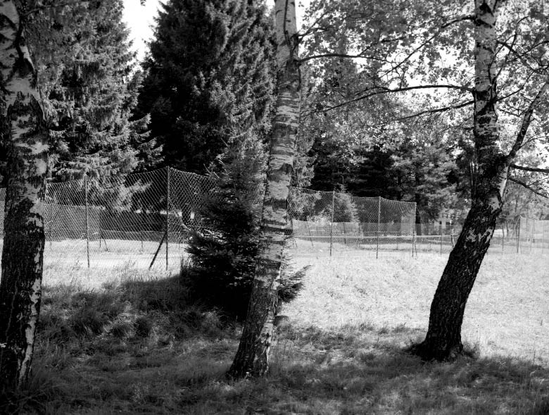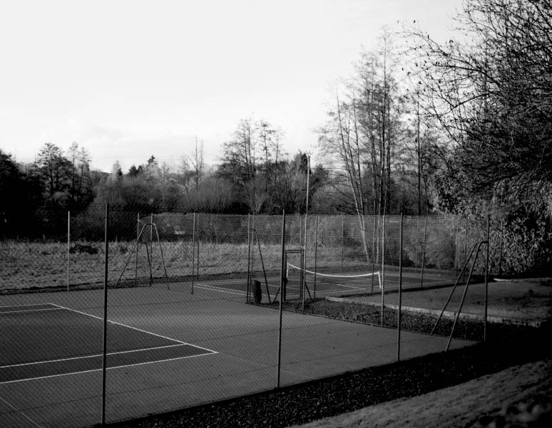 Le traitement sériel opéré par Bertoli avec ces terrains de tennis n’induit aucune systématisation du cadrage, l’angle de vue se renouvelle à chaque photographie. Son approche consiste littéralement à tourner autour du sujet, à l’embrasser de façon plus ou moins large pour toujours laisser apparaître des indices contextuels. La forme même de l’objet a dicté la marche à suivre : une aire de jeu n’est pas une construction architecturale massive, ce n’est pas un objet opaque sur lequel bute le regard, mais une délimitation ou un aménagement d’espace qui interrompt autant qu’il laisse voir le paysage. C’est via l’appareil photographique et le grillage que le regard de l’artiste a traversé ces zones vides. Cette souplesse du regard, des points de vue, permet de souligner l’intégration de l’aire de jeu dans le paysage, elle devient un élément du décor qui participe par contraste à la composition du paysage.